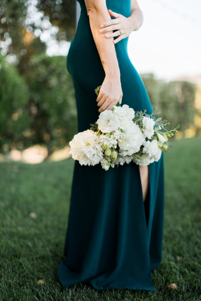Nestled among towering trees, this backyard wedding felt like an escape into a storybook setting. The color story combined emerald green chairs with gold accents, a gray tablecloth, and florals in moody shades of maroon, red, blush, and burgundy.