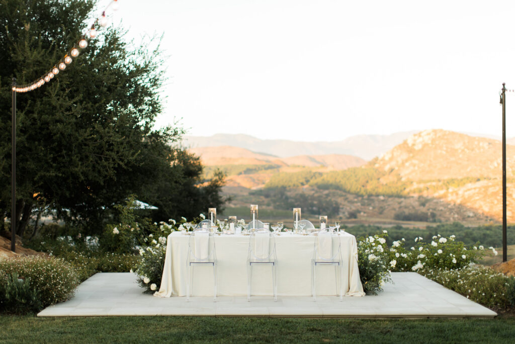 A banquet table was styled with crisp light gray linens and topped with tall candles and glassware that shimmered as the light shifted. The all-white florals and greenery balanced the deeper hues perfectly, creating a sophisticated contrast that felt intentional. This backyard wedding idea is perfect for couples who love minimalist details, clean lines, and a more formal evening celebration.