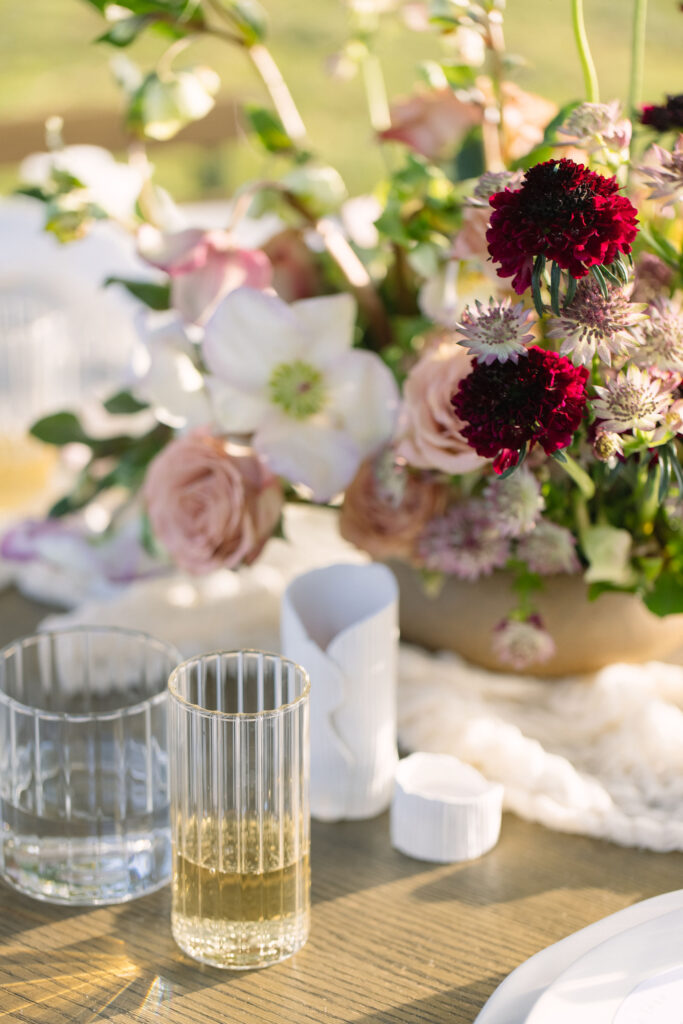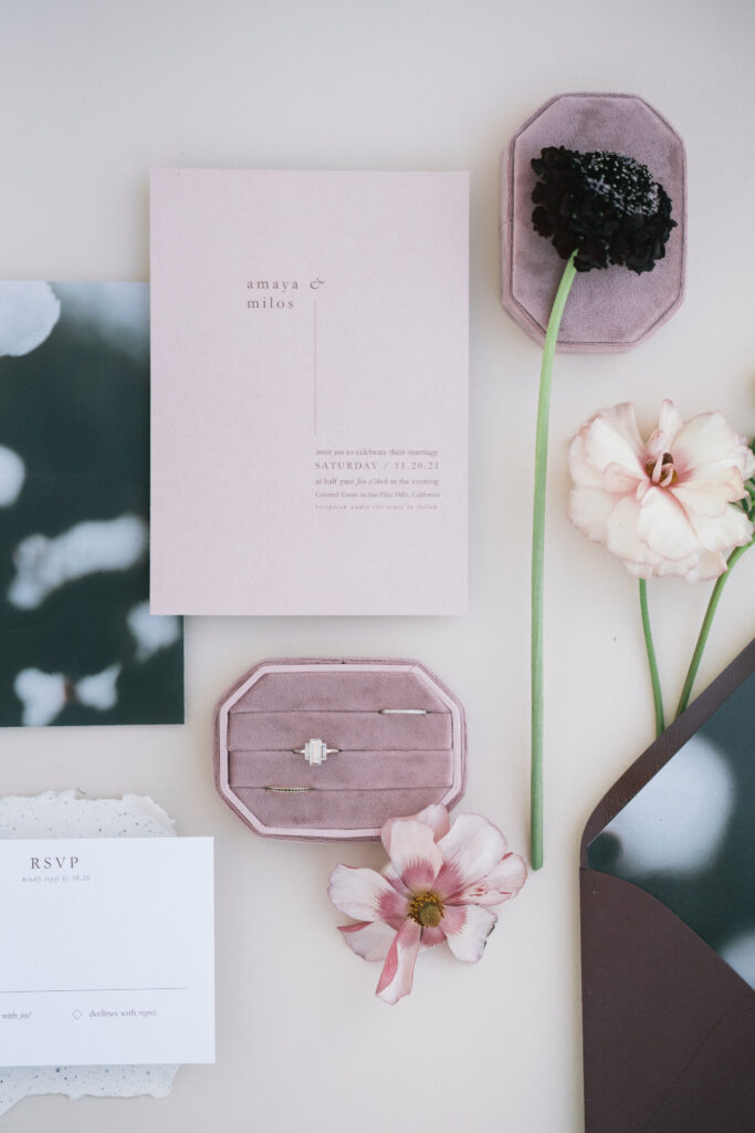 Simple candles and simple glassware kept the tablescape from feeling crowded, while every piece had a place and purpose. Other details consisted of invitations with mauve and cream tones and soft calligraphy, styled with florals in coordinating hues. The design felt deeply personal. This is ideal for couples who value mood, intimacy, and a cohesive visual story.