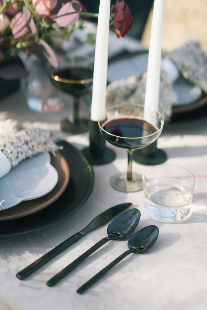 Black plating and cutlery gave the table depth and edge against the light gray linens. Invitations in mauve and burgundy, paired with soft pink florals and trailing green stems, pulled everything together. This style is perfect for couples who want an outdoor setting with a more dramatic, layered aesthetic, especially for fall or forest venues.