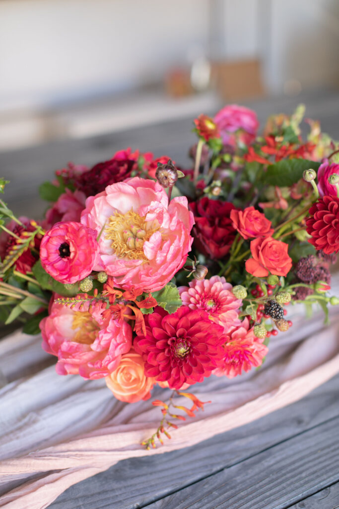 This next backyard wedding was full of life. Bright coral and pink florals popped against wooden table settings, while deep green foliage grounded the look with richness and depth. Every element felt vibrant and joyful without being overwhelming.