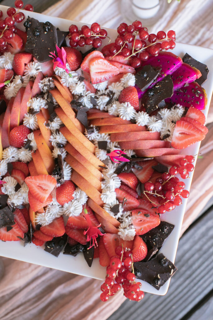 Guests were greeted with elegantly arranged charcuterie boards, garnished with florals and herbs. Petite desserts like pink and red macarons brought a hint of playfulness to the sophisticated spread. Small, round tables with floral centerpieces created a cozy and welcoming space. This setup is a dream for couples who want their personality to shine through color and creativity, especially in a warm-season setting.