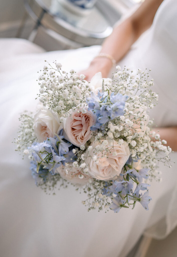 For brides wanting a bit more color, soft neutrals like champagne, blush, or pale blue can be incorporated in subtle ways. Summer bouquets feel most elegant when the palette is limited and the focus is on quality blooms and thoughtful composition.