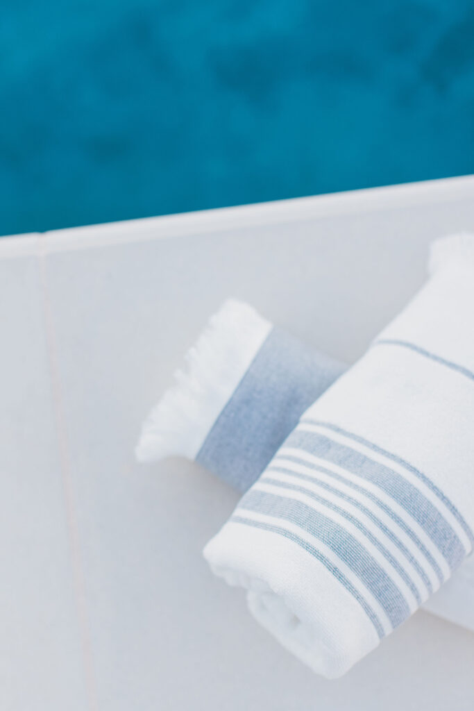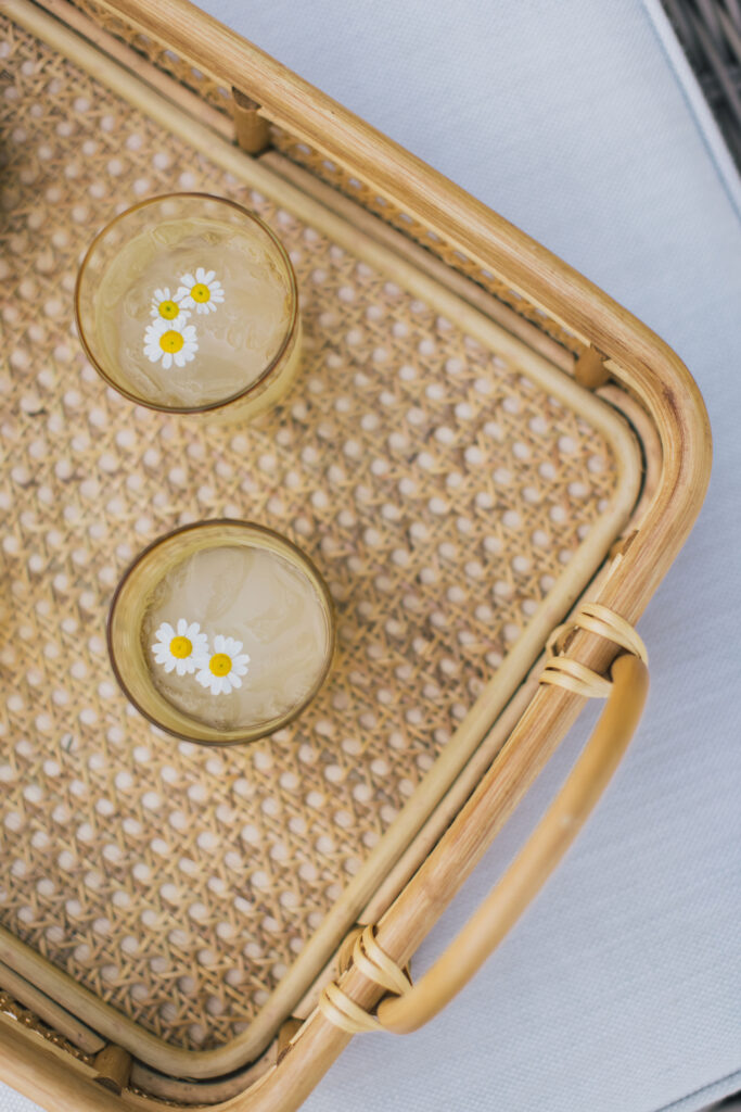 Don’t be afraid to place delicate florals in drinks for extra flair (edible flowers or even a sprig of lavender can make a simple glass feel elevated). Add linen tablecloths in soft neutrals to your tables to keep things breezy and textural. Use rattan trays to serve drinks poolside, and tuck small blooms or greenery into the edges for an added layer of detail.