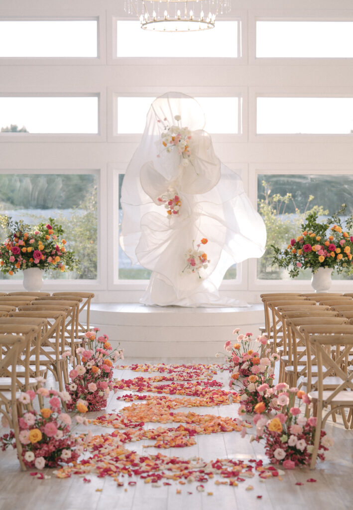 One of the reasons couples love The Wildberry Farm is that the outdoor spaces feel private and intentional. There’s an intimate ceremony setup with a few rows of chairs and a floral backdrop that frames the vows without distracting from them.